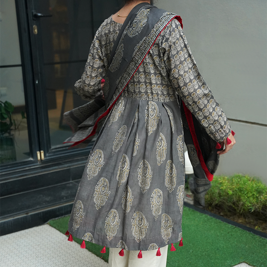 Crimson Threads – Grey Ajrak Suit with Red Appliqué