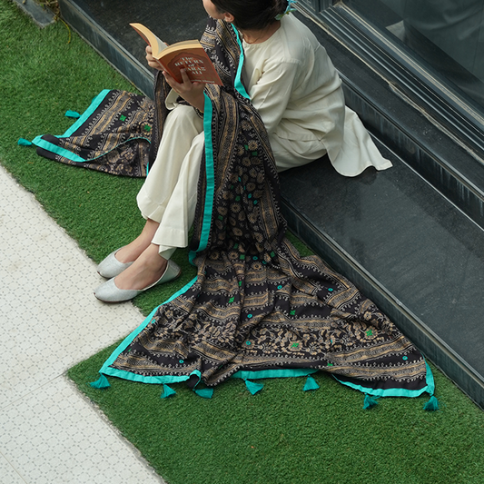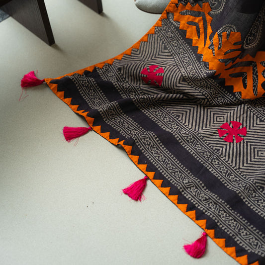 Handcrafted Black Silk Scarf with Block Print & Tassel Accents