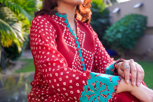 Maroon Handcrafted Chunri Silk Two-Piece Set with Turquoise Appliqué