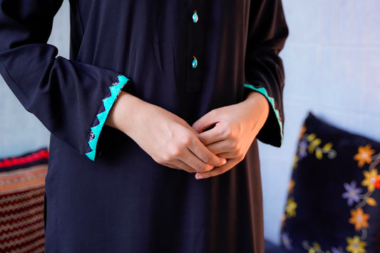 Sleek Black Linen Kurta Set with Aqua Applique Trim