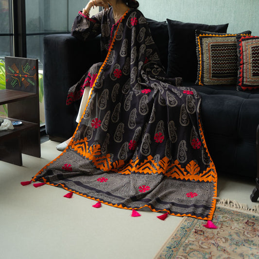 Elegant Black Silk Chunri Set with Handcrafted Appliqué Details