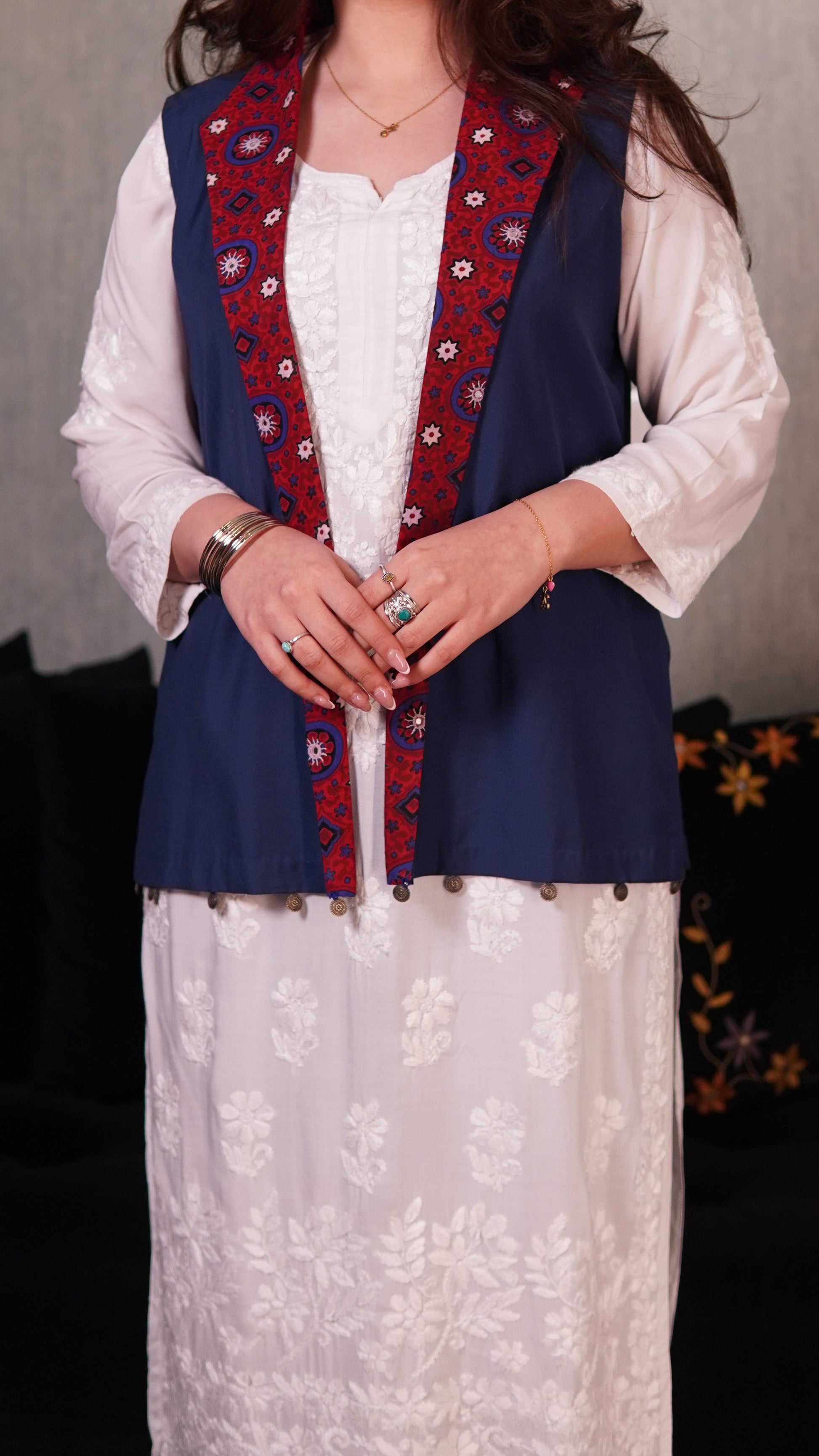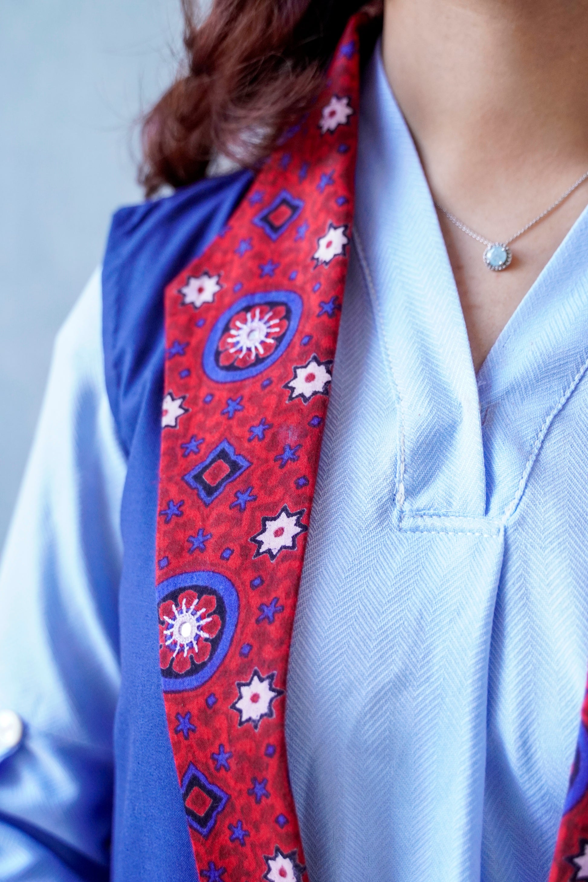 A modern take on timeless tradition. This blue Waistcoat is tailored from premium suiting fabric and elevated with a beautifully crafted Ajrak fabric lapel, celebrating rich heritage through contemporary design. The structured silhouette and sleeveless cut make it a versatile layering piece for any occasion.