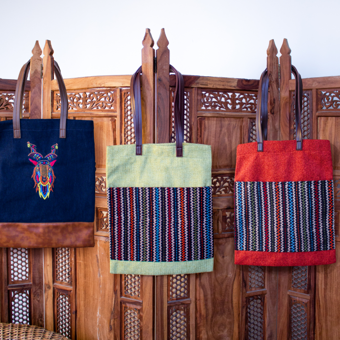 This green jute tote bag features a beautifully hand-embroidered pocket made from naturally dyed Ajrak fabric. The intricate zig-zag stitching adds texture and cultural richness, making this tote a perfect companion for those who appreciate heritage and modern design coming together in one stylish piece.
