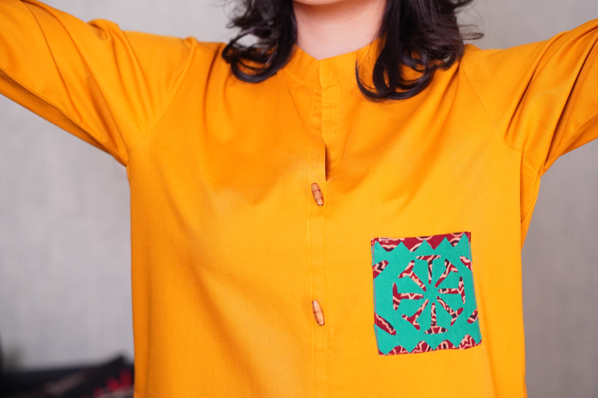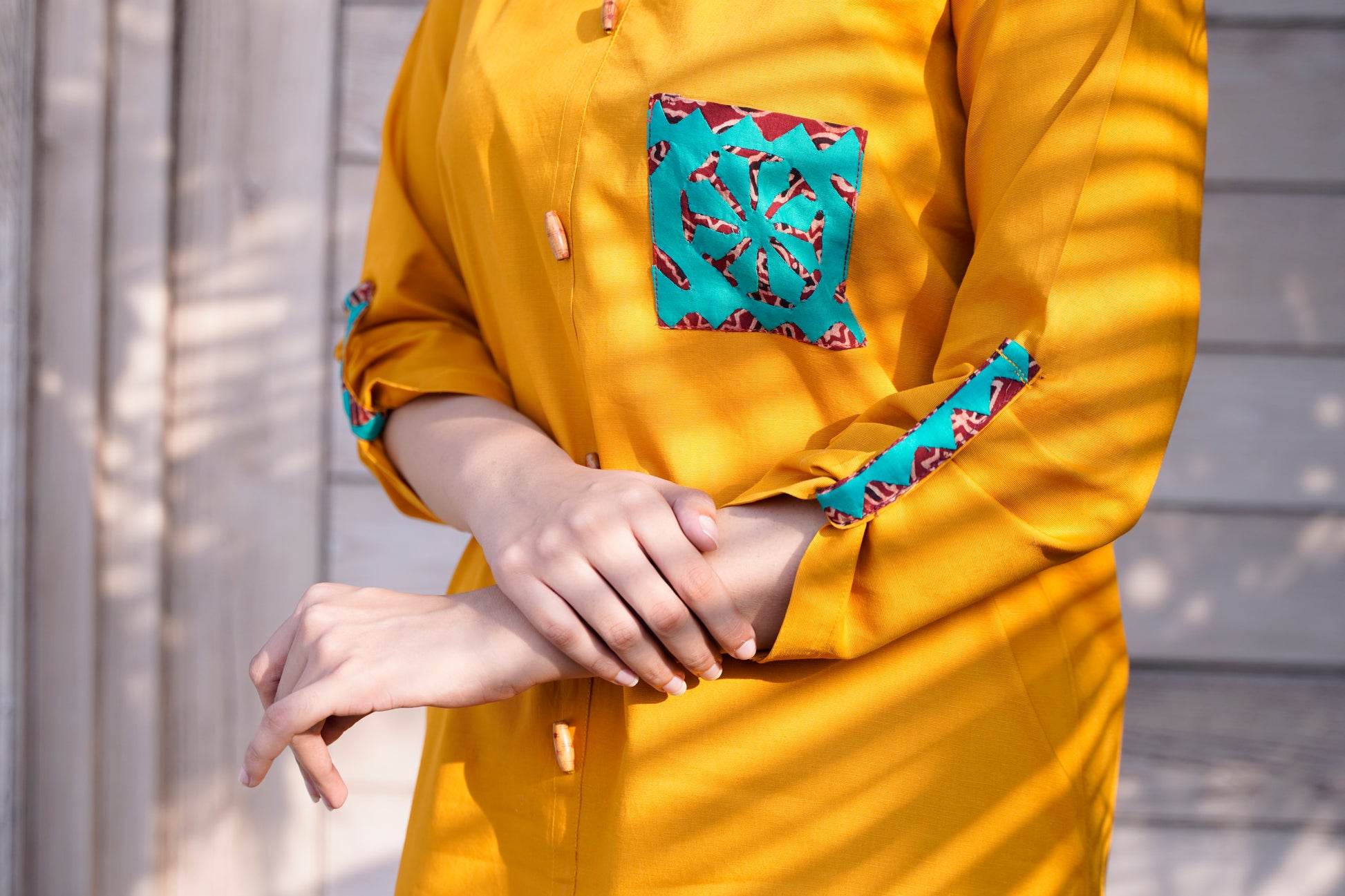 The mustard kurta features a minimalist straight-cut design with a contrasting turquoise printed pocket for a pop of color and individuality. Paired with rust Ajrak print wide-leg trousers, this set brings a touch of ethnic artistry to a contemporary silhouette.