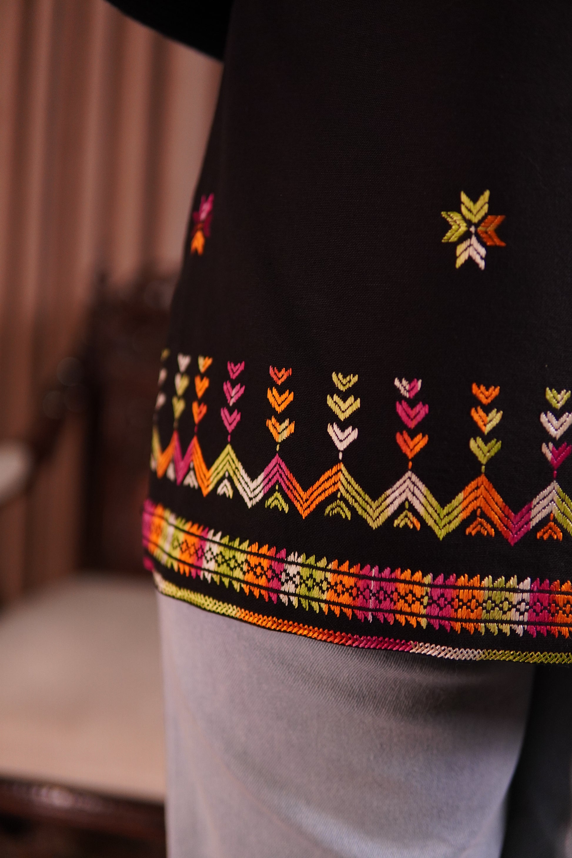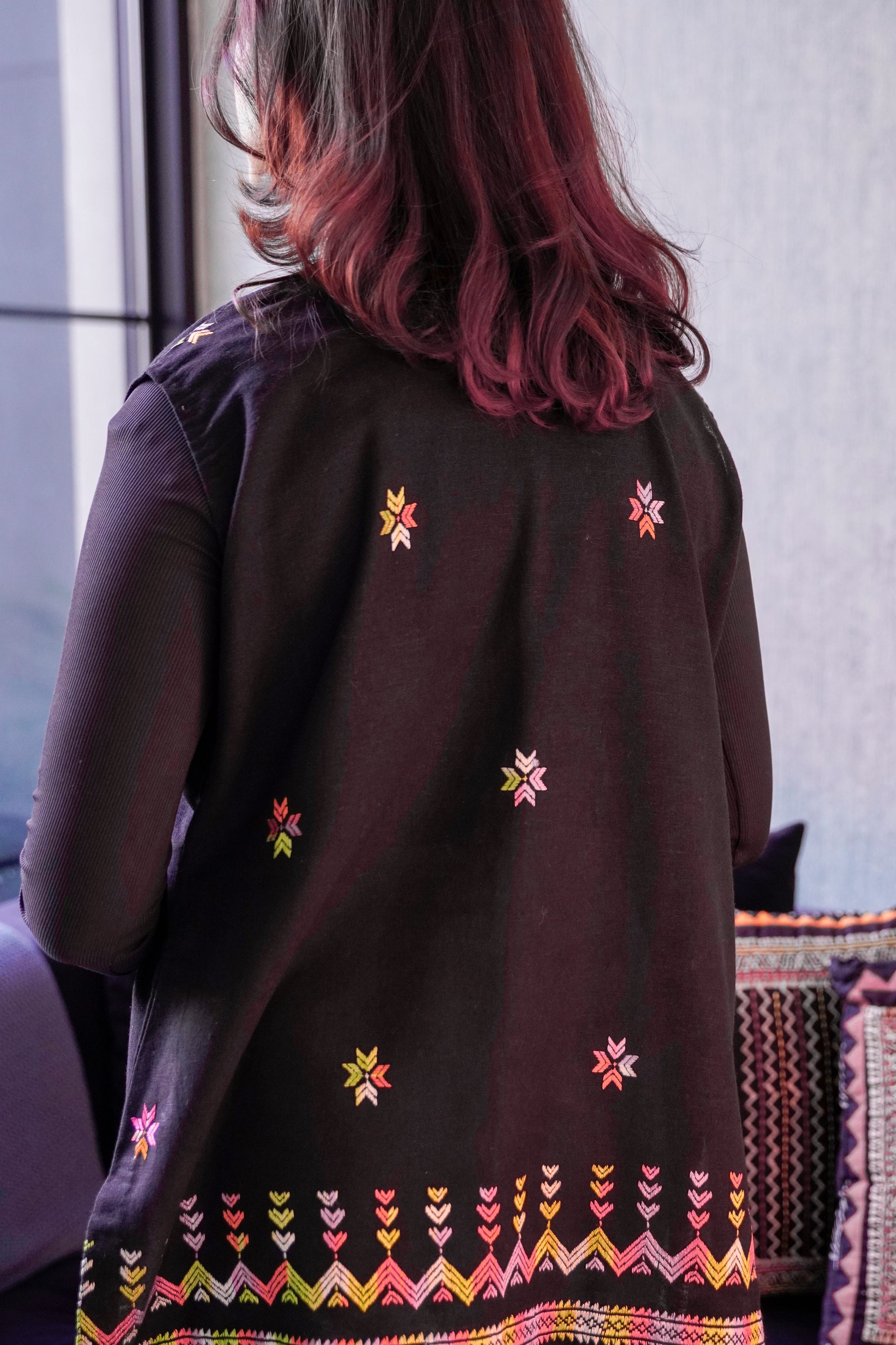 Elevate your everyday style with this stunning black embroidered vest, a perfect blend of ethnic craftsmanship and modern fashion. Featuring vibrant multicolor thread embroidery along the hem and delicate floral motifs across the body, this piece brings a lively burst of color to any outfit.